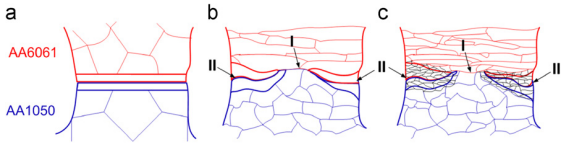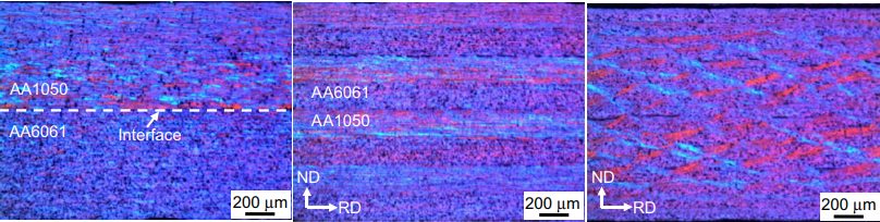 而su[2]等學(xué)者研究發(fā)現(xiàn)退火處理后的AA1050/AA6061板材經(jīng)過累積軋制的超細(xì)晶多層復(fù)合材料在不同道次下界面會(huì)呈現(xiàn)不同特征,初始三個(gè)道次內(nèi),不同鋁合金母材基本上能夠同步協(xié)調(diào)變形,但是當(dāng)軋制次數(shù)變多時(shí),AA6061界面就會(huì)發(fā)生頸縮,斷裂,最終發(fā)生界面紊亂。