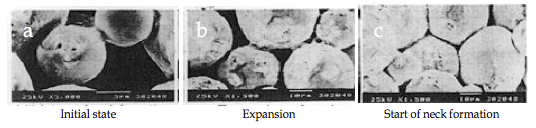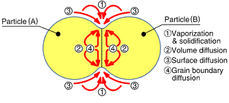 圖a顯示了由于等離子體中的火花引起的頸部形成的初始階段的行為。熱量立即從火花放電柱的中心傳遞到球體表面并擴散,使得晶間結(jié)合部分快速冷卻。如圖b所示,其顯示了幾個頸部,脈沖在顆粒之間一個接一個地引起火花放電。即使單個顆粒,隨著重復(fù)放電,在相鄰顆粒之間形成頸部的位置的數(shù)量也增加。圖c顯示了SPS燒結(jié)晶界的狀態(tài),該燒結(jié)晶界在燒結(jié)進一步發(fā)展后發(fā)生塑性變形。