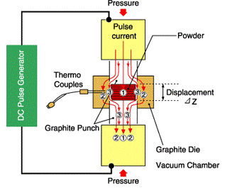SPS工藝是一種電燒結(jié)技術(shù),它將來自于脈沖發(fā)生器的脈沖電流施加到顆粒粉末上(見下圖),除了促進上述燒結(jié)的因素外,發(fā)生在粉末顆粒之間的有效放電,也促進了燒結(jié)。
